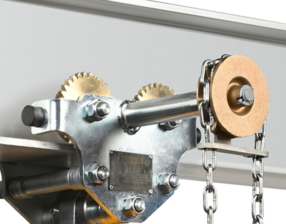 Los rodillos anti-patadas limitan la capacidad de inclinación del trole cuando no tiene carga debido al peso de la rueda/cadena manual.